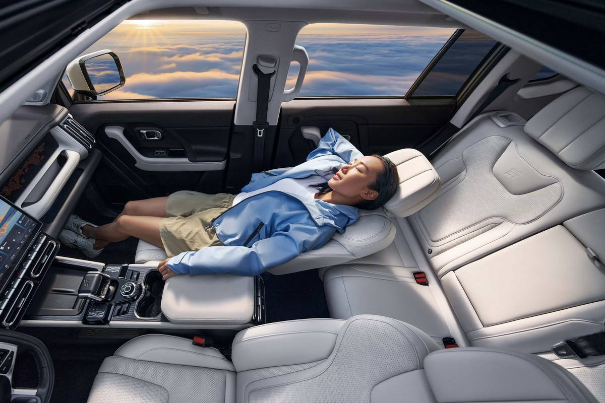 Центральная консоль продумана для комфорта: здесь разместились мощное беспроводное зарядное устройство на 50 Вт, стильный поворотный селектор режимов движения, подстаканники и массивный рычаг КПП. Особое внимание уделено комфорту пассажиров: передние сиденья имеют электрорегулировку, вентиляцию и подогрев, а на втором ряду установлен центральный подлокотник со встроенной сенсорной панелью для управления подогревом, вентиляцией и даже массажной функцией. Дополнительными преимуществами стали система помощи водителю второго уровня (ADAS), двухслойные звукоизоляционные стекла и тонированные задние стекла.