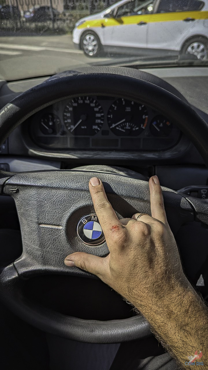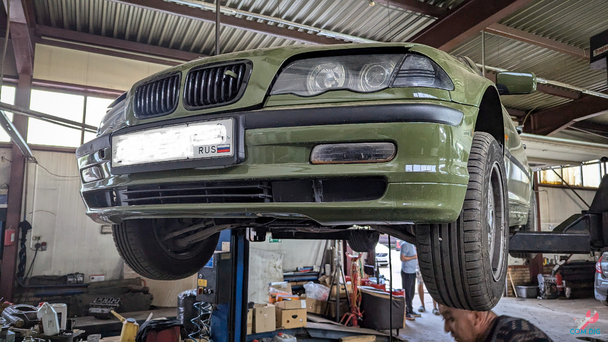 Первые же минуты владения стали проверкой на прочность. Я не мог тронуться, потому что не разобрался с селектором АКПП, а на первом же повороте залипли поворотники. Это было унизительно. На следующий день начались поиски СТО, которое возьмется за сборку салона, замену цепи ГРМ и ремонт поворотников. Но прежде предстояло поставить машину на учет — отдельная эпопея на полтора дня. Инспектор попросил открыть капот, а механизм открывания был нерабочим: тросик болтался, и требовалось два человека. Главным испытанием стал поиск номера двигателя, который оказался в почти недоступном месте, покрытым ржавчиной. Пришлось снимать колесо, использовать пескоструй, преобразователь ржавчины и даже покупать эндоскоп, чтобы сделать снимок. Выяснилось, что двигатель не родной, а контрактный M47, что, впрочем, было даже плюсом.