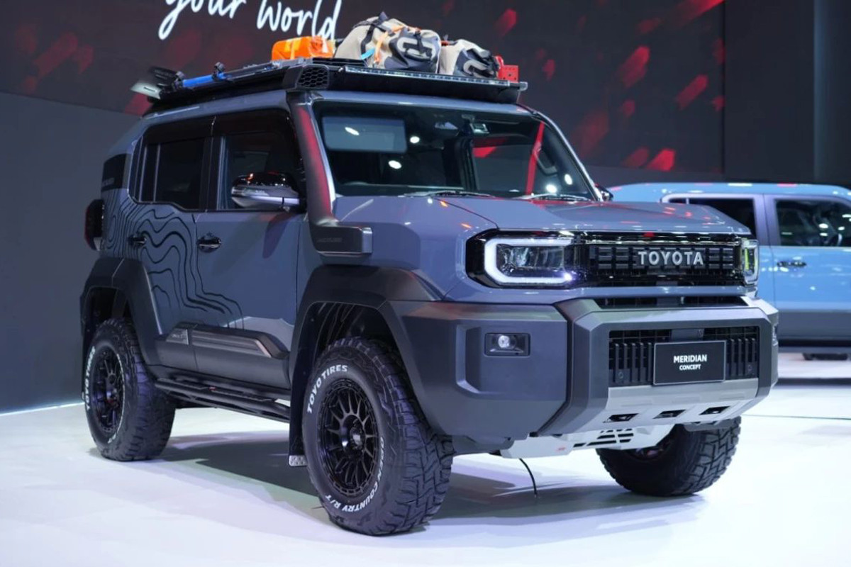 Концепт Meridian создан для покорения бездорожья. Он отличается серо-синей окраской с топографическим принтом, усиленной защитой элементов днища и шноркелем для преодоления глубоких бродов. На крыше установлен экспедиционный багажник с канистрой, а по бокам — силовые подножки. Ходовая часть модернизирована: установлены новые амортизаторы и пружины для увеличения хода подвески. Колёса — 17-дюймовые диски Lenso MX Dinero с внедорожными шинами Toyo Open Country R/T.