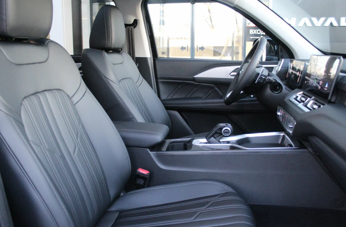 В солнцезащитных козырьках установлены зеркала без подсветки. Между передними креслами расположена одноуровневая консоль с подлокотником (без охлаждения), двумя подстаканниками, электронным селектором трансмиссии, кнопками электростояночного тормоза и активации подогрева передних сидений.